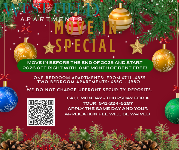 West Field apartments features the amenities you need. We have ample parking for you and your guests and laundry facility. Our community loves pets as much as you do so bring them along. Finding the right apartment home to fit your needs has never been easier. Give us a call to schedule a tour and see why West Field is the right fit for your new apartment in Grinnell, IA.